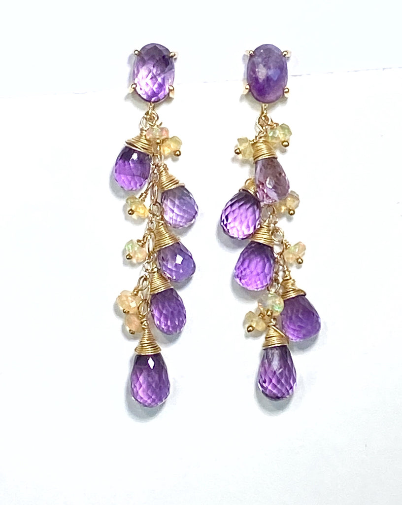 Full body, faceted amethyst teardrop briolettes are wire wrapped in gold vermeil wire to dangle on gold filled chains with super fiery Ethiopian opals to create these unique, handmade amethyst post earrings.