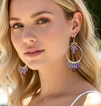 The rich color palette of blues, purples, and violets creates a sophisticated and eye-catching effect that works with everything from casual jeans to elegant evening wear. Each gemstone is carefully selected for quality and color, then wire-wrapped by hand to create a cascading design that catches light beautifully. The amethyst makes these perfect for February birthstone celebrations, while the variety of complementary gemstones adds depth and visual interest. These statement earrings are long enough to make an impact yet lightweight enough for comfortable all-day wear.