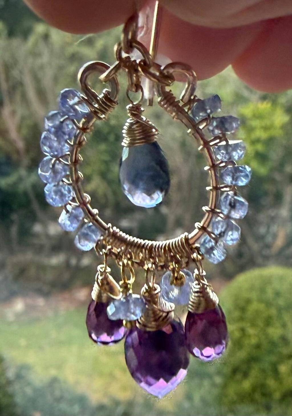 Dangling below are amethyst and violet quartz teardrop briolettes while beautiful tanzanite rondelles dangle in between these drops.