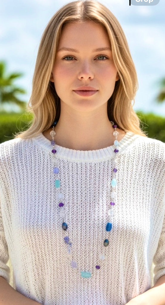 Wear as a single long strand for dramatic elegance, or layer with shorter necklaces for a modern, curated look. The cool blue and purple tones pair beautifully with neutrals, whites, silvers, and navy, and add sophisticated color to black. Perfect for both casual and formal occasions—dress it down with a simple blouse or elevate an evening gown.