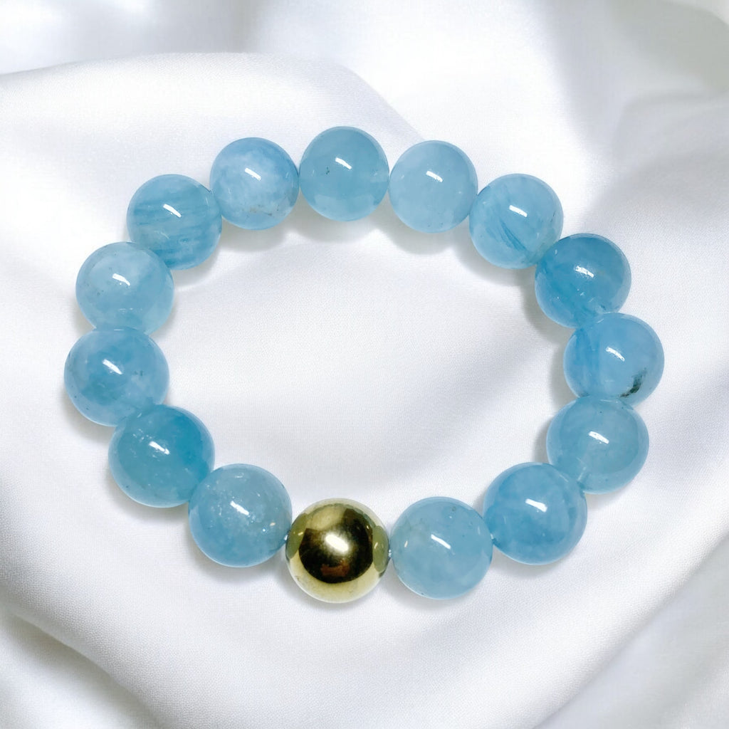 Smooth, natural blue aquamarine gemstone beads, 12mm, mix with a single gold quartz 12mm bead that gleams in the color of 18kt gold.