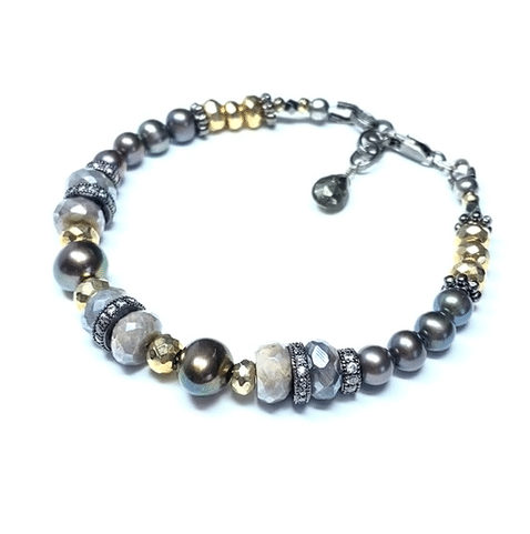 Freshwater pearls in shades of peacock gray and bronze mix with shaded mystic moonstone faceted beads in gray and flesh tones with faceted golden pyrite to create this elegant bracelet.