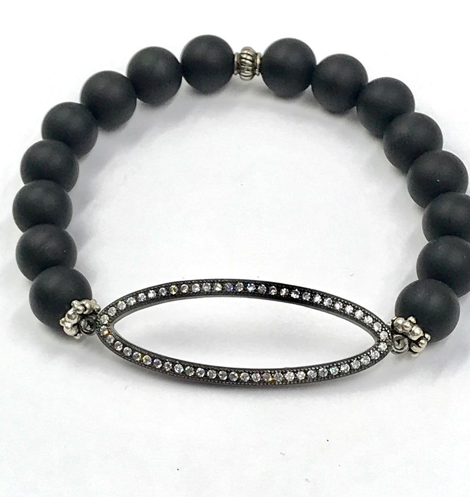 This is a simple layering bracelet featuring a CZ charm of a pave ellipse in sterling silver oxidized mounted on a stretch bracelet of black onyx smooth frosted rounds, 8mm. Great for layering with other bracelets you may have or are offered here in my shop.