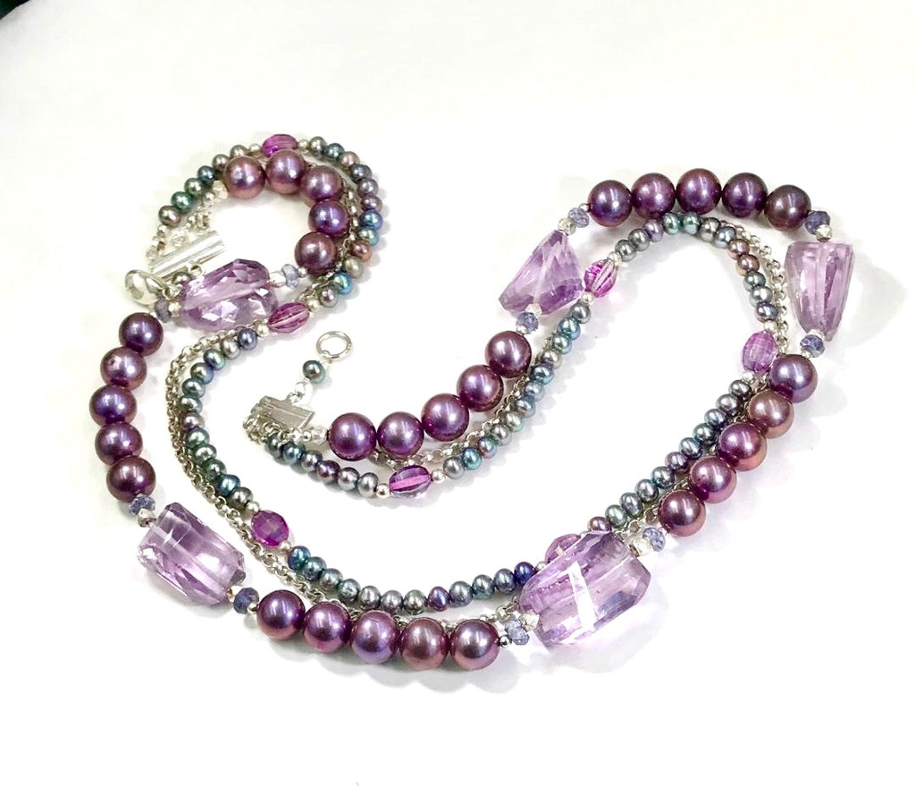 Amethyst Necklace Multi-strand Gemstone Necklace Pink Amethyst Plum Pearl Statement Necklace Luxury Triple Strand Collar February Birthstone