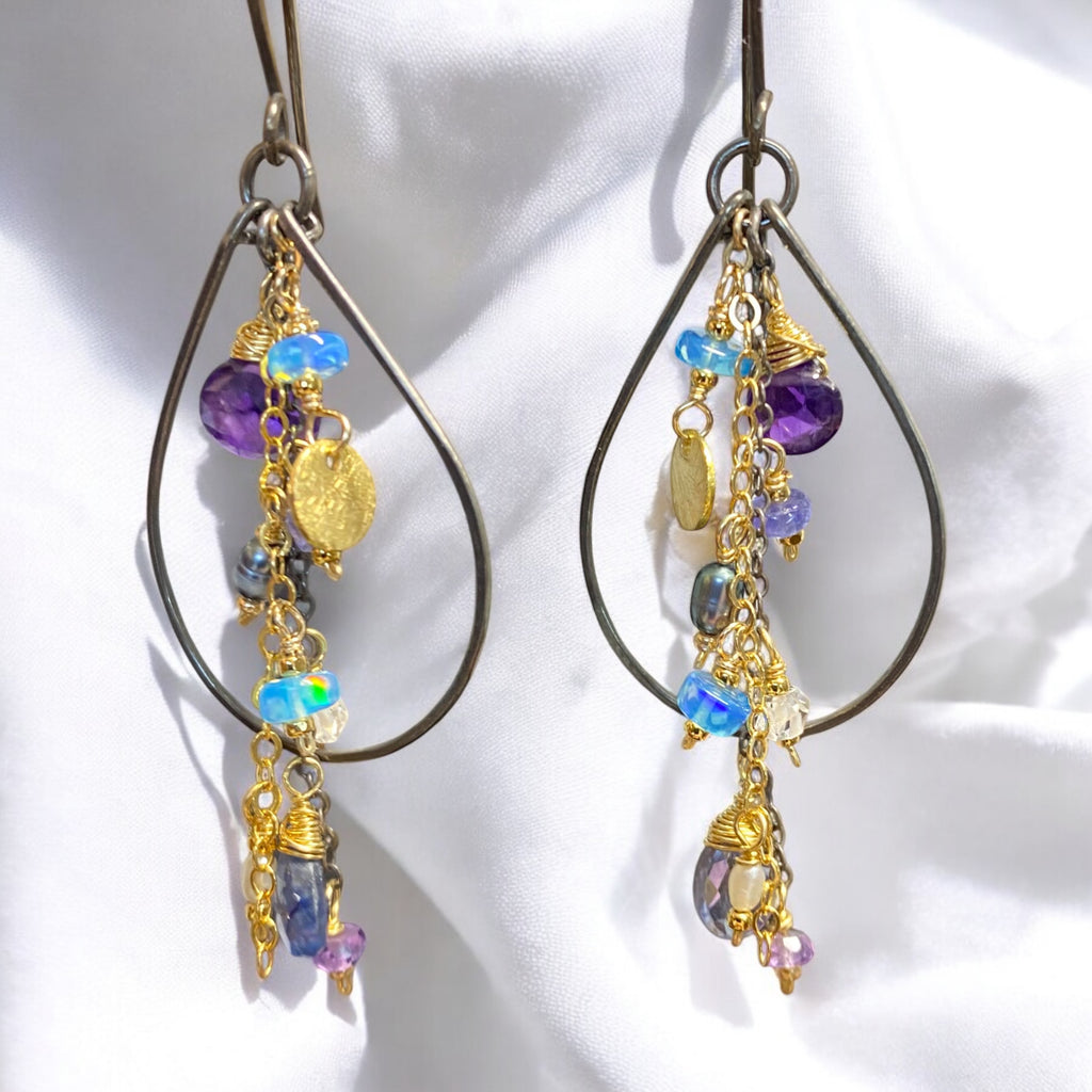 Hand forged, oxidized and polished, (to a dark gunmetal sheen) sterling silver hoops dangle mixed metal chains of gold fill and sterling silver bearing blue violet gemstones, lavender opals, Herkimer diamond crystals and more to create these flirty hoop earrings.