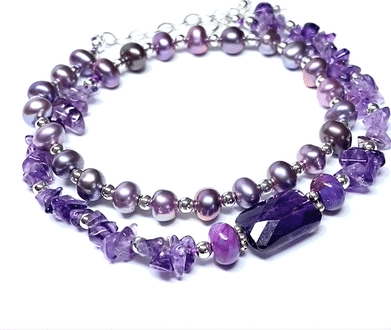 Shimmery lavender plum pearls mix with amethyst chips, purple turquoise and a faceted amethyst gemstone chicklet create this double wraparound silk knotted bracelet.