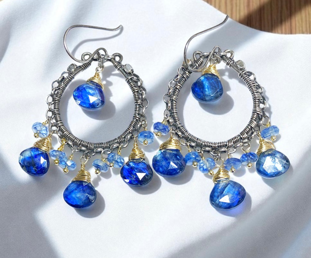 Beautiful blue kyanite heart shaped faceted briolettes are wire wrapped in 14 kt gold filled wires to dangle from oxidized and polished sterling silver hand forged hoop chandelier earrings.
