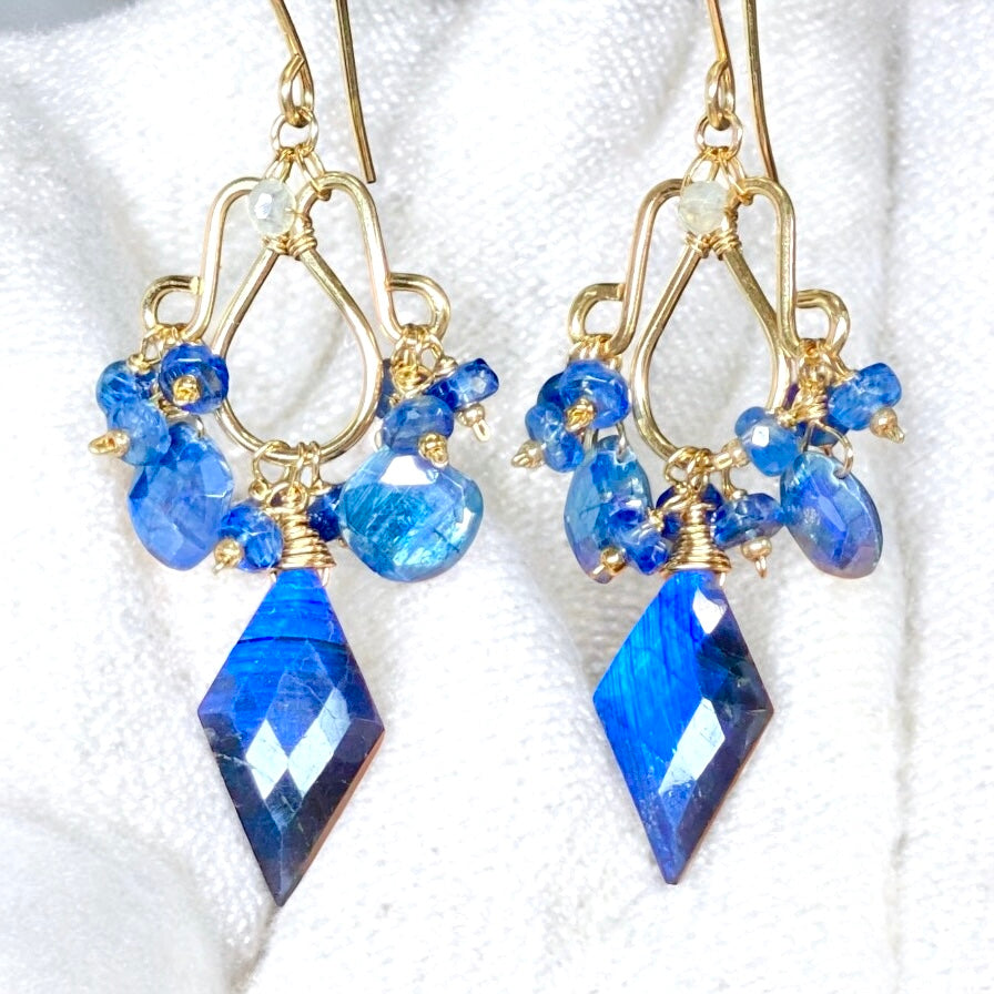 Hand forged chandelier forms in 14 kt gold fill dangle fancy cut blue flash labradorite drops in their centers and mystic blue kyanite faceted drops on their outer "arms" to create these glamorous earrings.