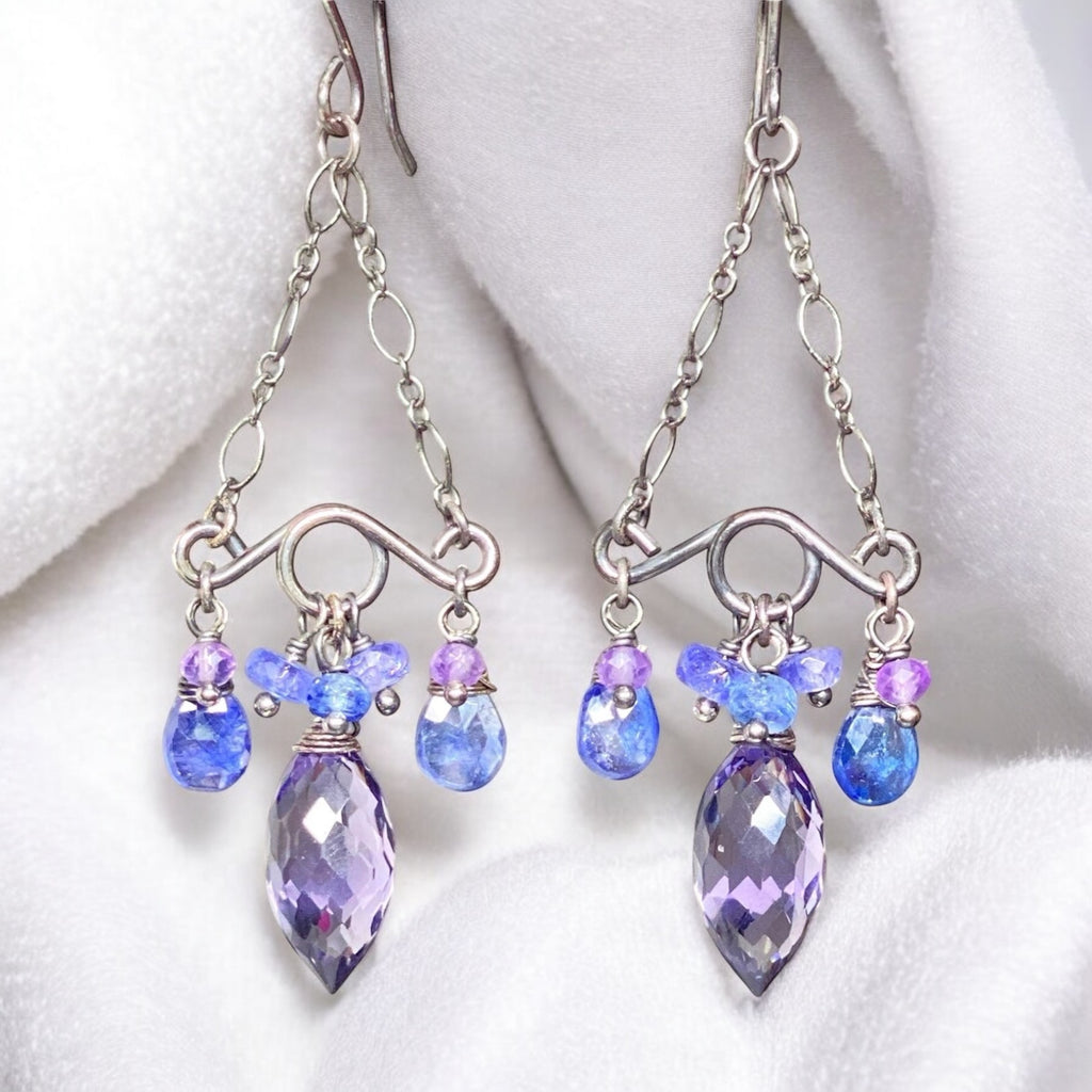 Blue Purple Gemstone Handmade Chandelier Earrings Oxidized Silver Tanzanite