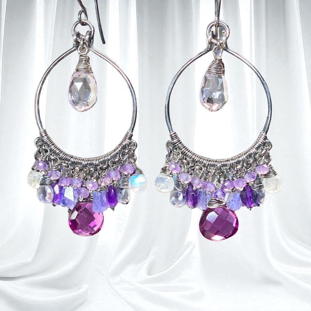 Hand forged, oxidized and polished sterling silver chandelier forms are wire wrapped with chains to dangle an alluring collection of blue, purple and violet gemstones that you can't help feeling beautiful wearing!
