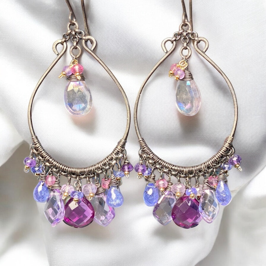 These romantic colors of violet magenta, periwinkle blue and pink lavender are intensified by the gunmetal hand finish on the handmade hoop forms, featuring tanzanite, amethyst, lavender and violet quartz gems.