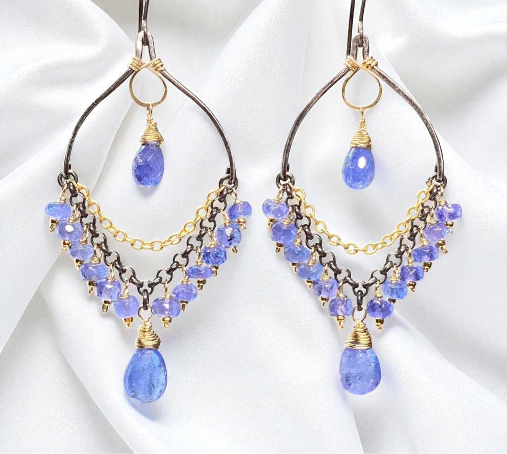 Hand forged, oxidized and polished earring forms dangle wire wrapped tanzanite briolettes in their centers and on the bottoms to create these feminine, boho chandelier earrings.