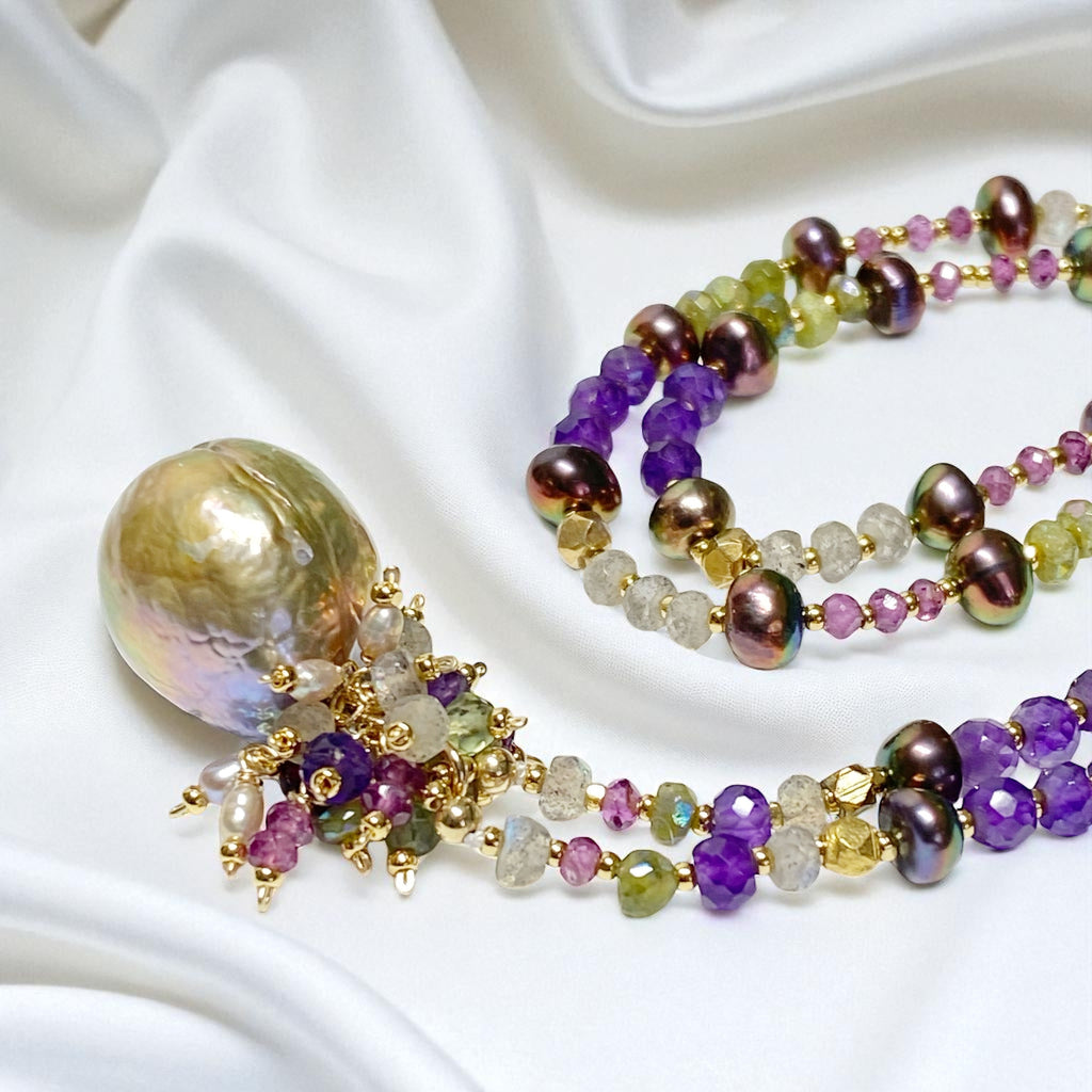 Clustering over the baroque pearl pendant are the same gemstones as in the necklace with cascading tiny pearls in a hue similar to the large pearls.