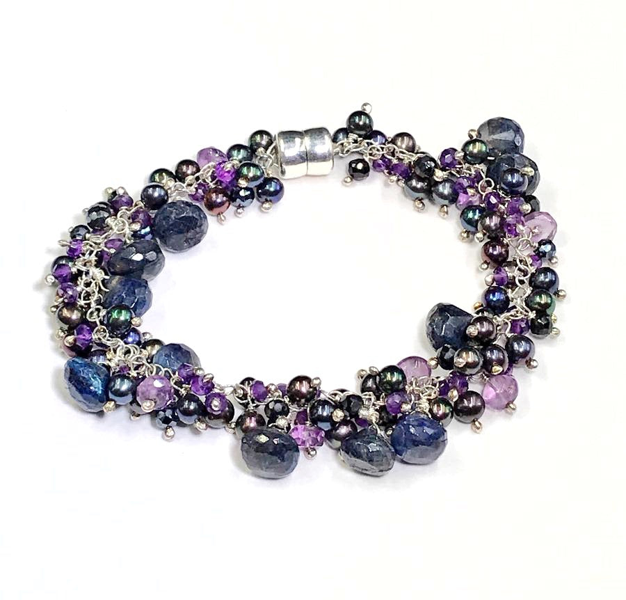 Blue Labradorite Amethyst and Pearl Gemstone Cluster Bracelet Sterling Silver