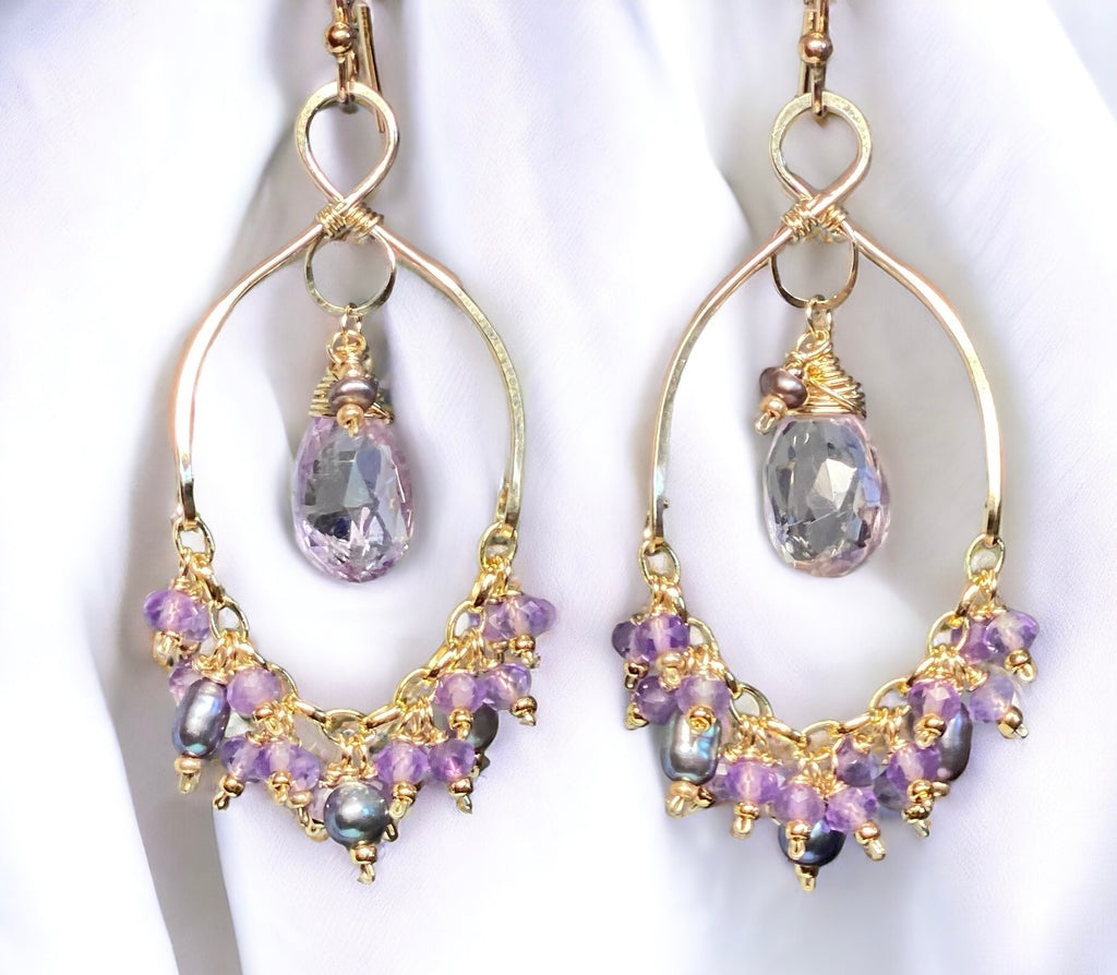 Hand forged, 14kt gold filled chandelier earring forms dangle wire wrapped sparkly lavender quartz briolettes at the top centers to create these feminine, boho chandelier earrings.