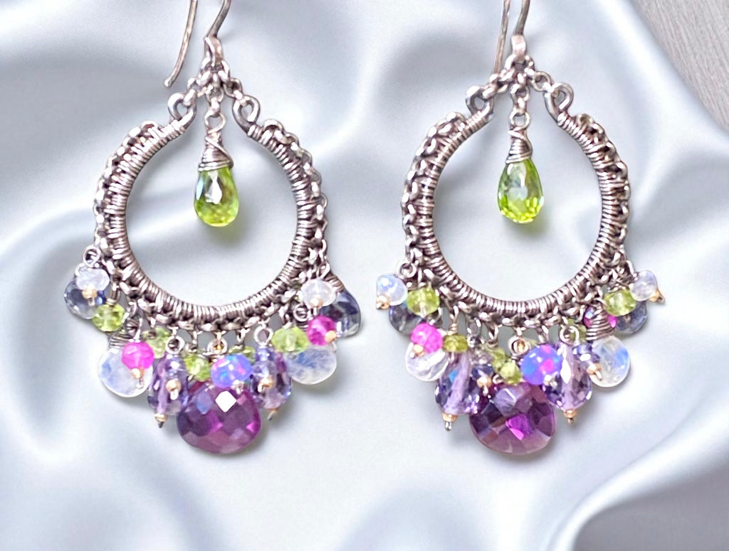 Multi Gemstone Chandelier Hoop Earrings - Peridot Lavender Violet