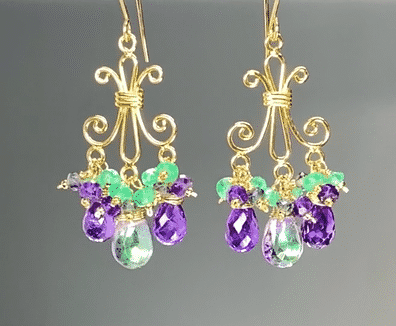 Gold vermeil Fleur de Lis chandelier forms dangle dazzling gemstones of genuine mystic topaz (not quartz) with purple amethyst gemstone faceted drops and clusters of green topaz faceted rondelles to create these beautiful earrings!
