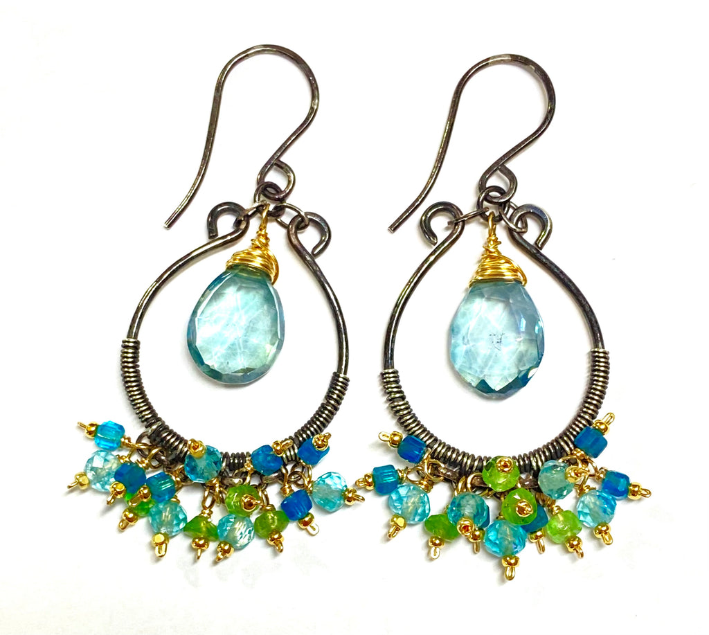 Beautiful, shimmering, faceted mystic aqua quartz briolettes, 13 mm, center hand forged oxidized and polished sterling silver hoops, mixing with clusters of aqua apatite, neon apatite and tsavorite gems at the bottoms.