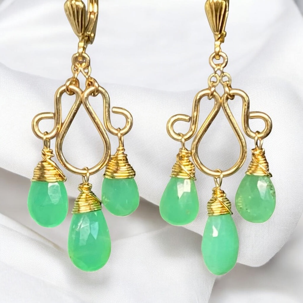 Genuine, green chrysoprase gemstones briolettes, wire wrapped in 14 kt gold filled wires dangle from hand forged 14 kt gold filled chandelier forms to create these glamorous earrings.