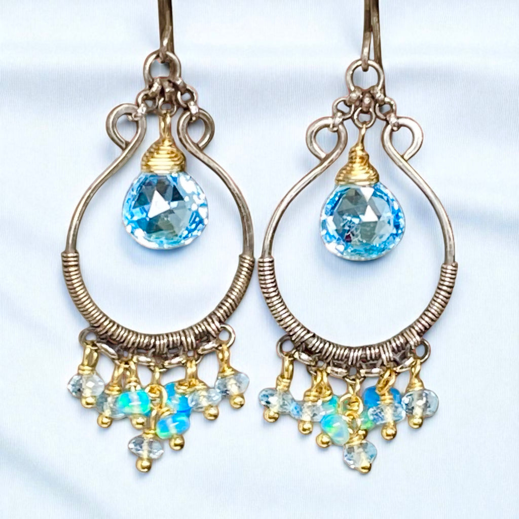Blue Topaz, Opal, Chandelier Hoop Earrings Oxidized Silver Mixed Metal