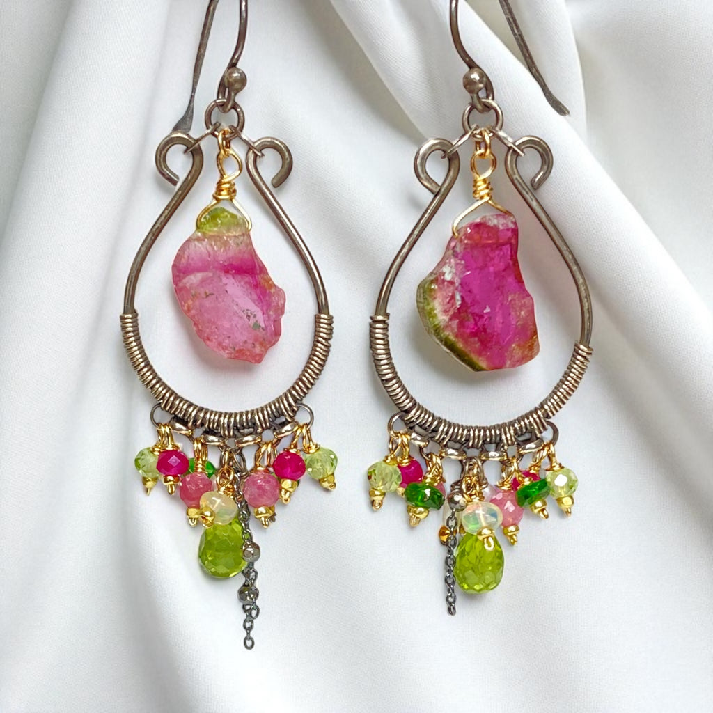 Pink Sapphire, Peridot, Watermelon Tourmaline Hoop Chandelier Earrings