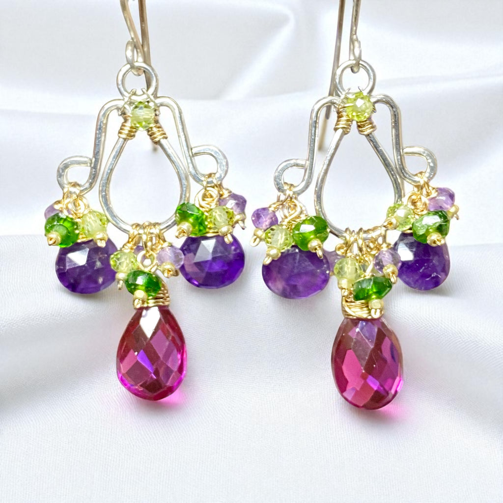 Handmade, sterling silver chandelier forms dangle violet, purple and green gemstones to create these feminine, elegant earrings.