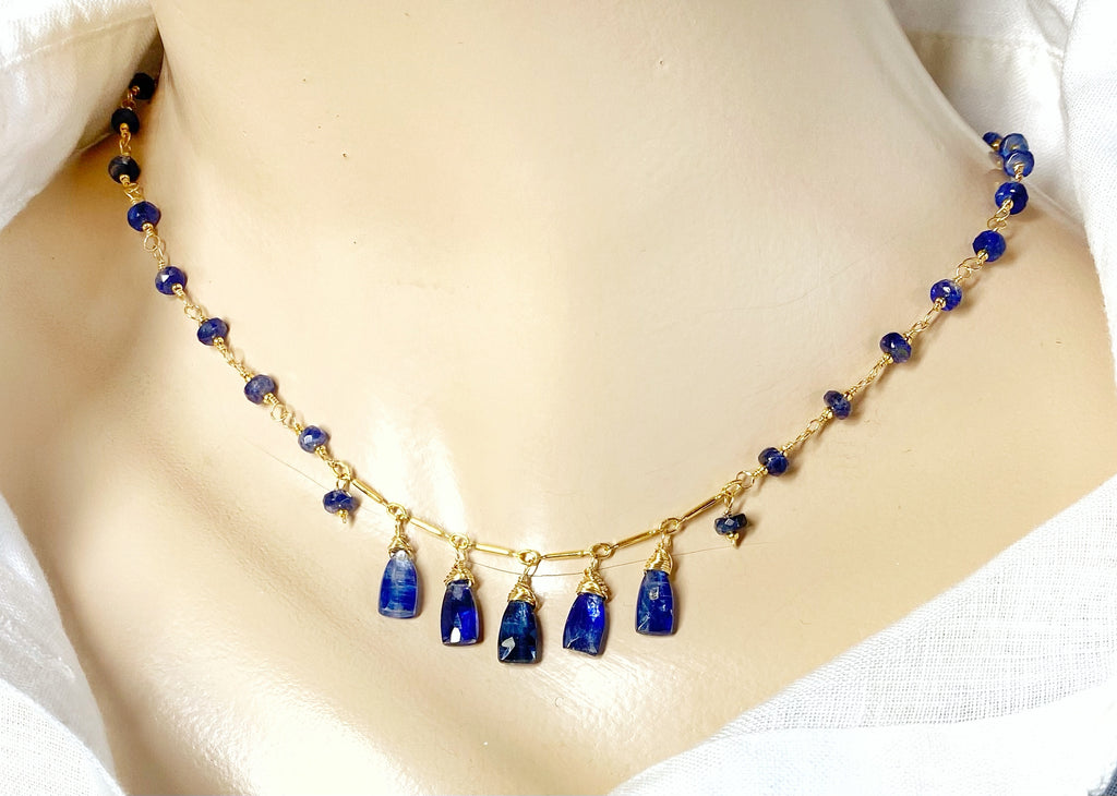 Gorgeous, faceted blue kyanite pyramid briolettes, 12 mm, are wire wrapped onto fancy 14 kt gold filled chain, dangling with faceted blue kyanite rondelles to create this enchanting blue gemstone, handmade necklace.