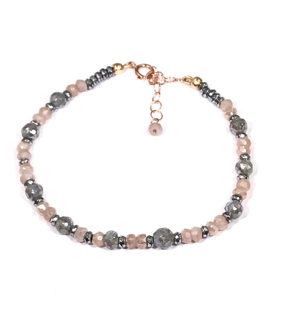 This listing is for a beautiful dainty bracelet of faceted blush mystic moonstone rondelles and mystic labradorite faceted rounds interspersed with sparkling silver hematite beads. It is an adjustable bracelet that coordinates easily with other bracelets - as seen in other photos.