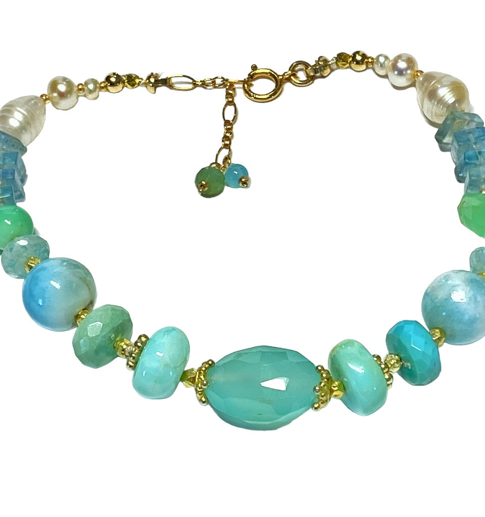 White freshwater pearls mix with gems of fluorite, chrysoprase, green Peruvian opal, larimar, Sleeping Beauty turquoise, blue Peruvian opal, aqua moonstone and aqua chalcedony to create this coastal grandmother style bracelet.