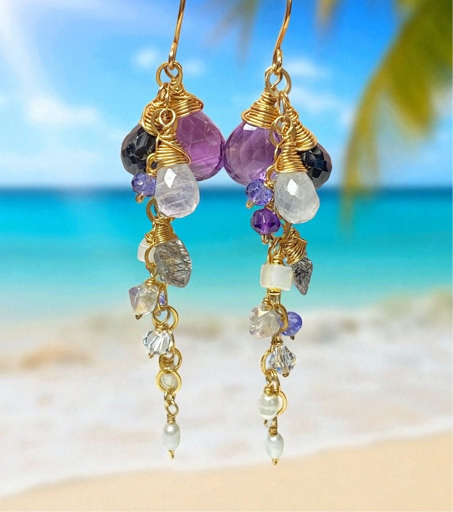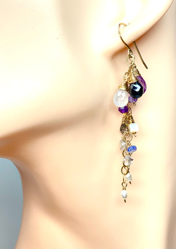 Sparkling briolettes of lavender amethyst, mystic black spinel and moonstone are wire wrapped to dangle with multi color gemstones on 14kt gold filled chains to create these colorful, unique, handmade dangle earrings.
