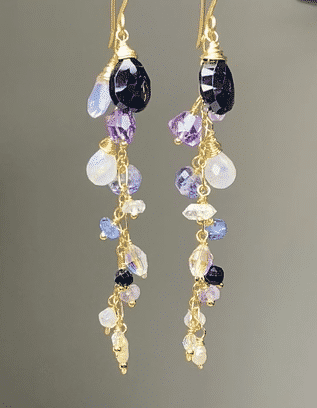 The gemstones are either wire wrapped in 14kt gold filled wires or mounted on 24kt gold vermeil ball headpins. In addition to the black spinel teardrops, the following gemstones are dangling: