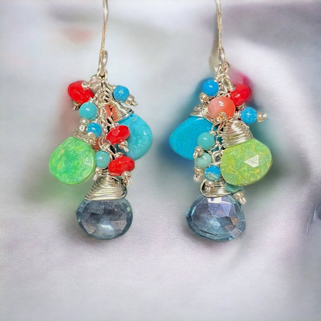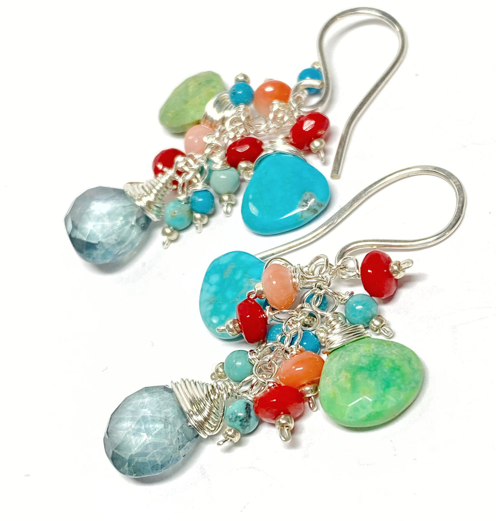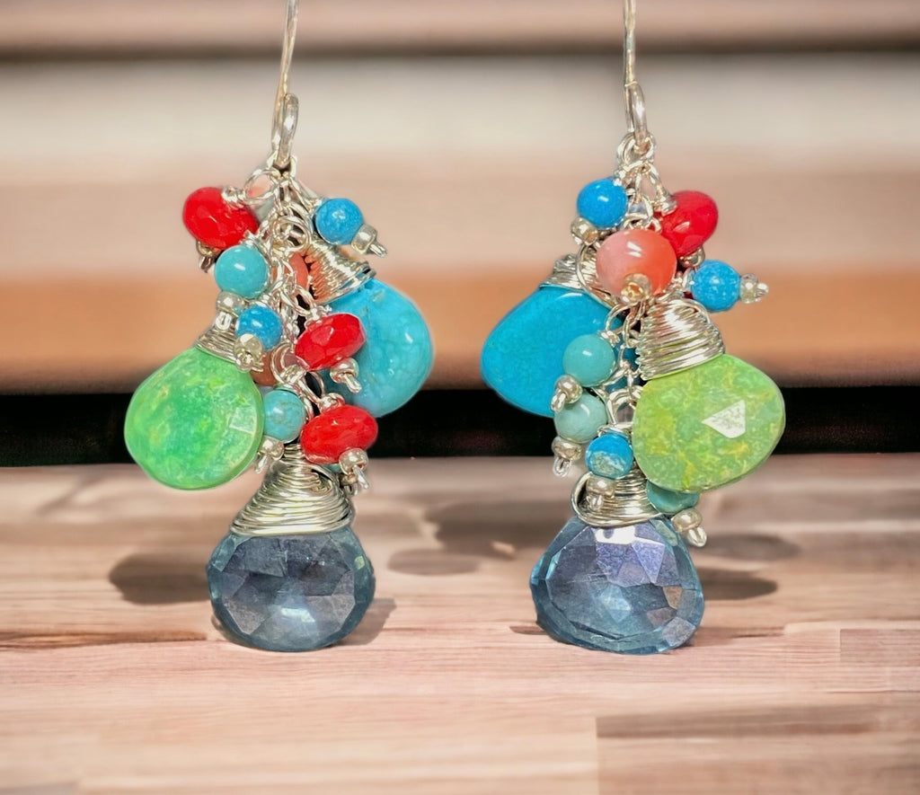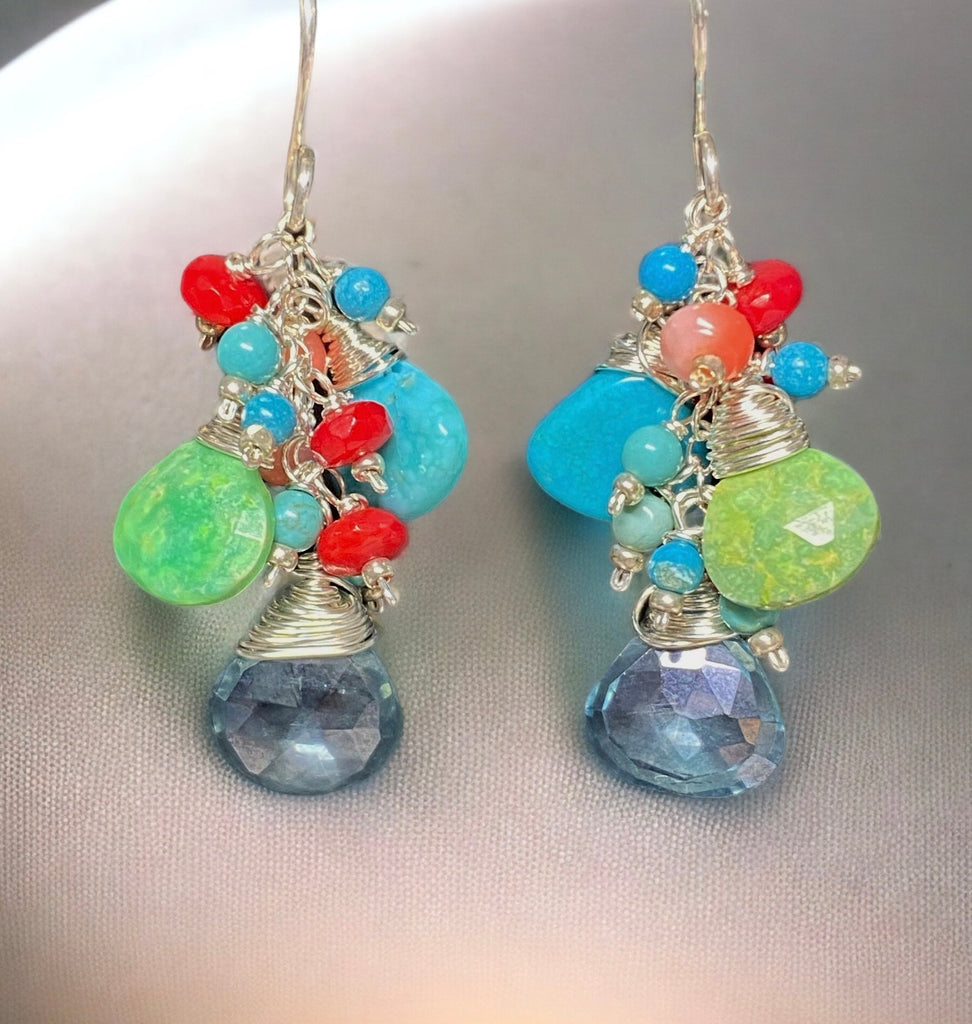 Kingman blue turquoise and green gaspeite turquoise briolettes are wire wrapped in sterling silver wires to dangle on sterling chains over shimmering teal quartz briolettes.