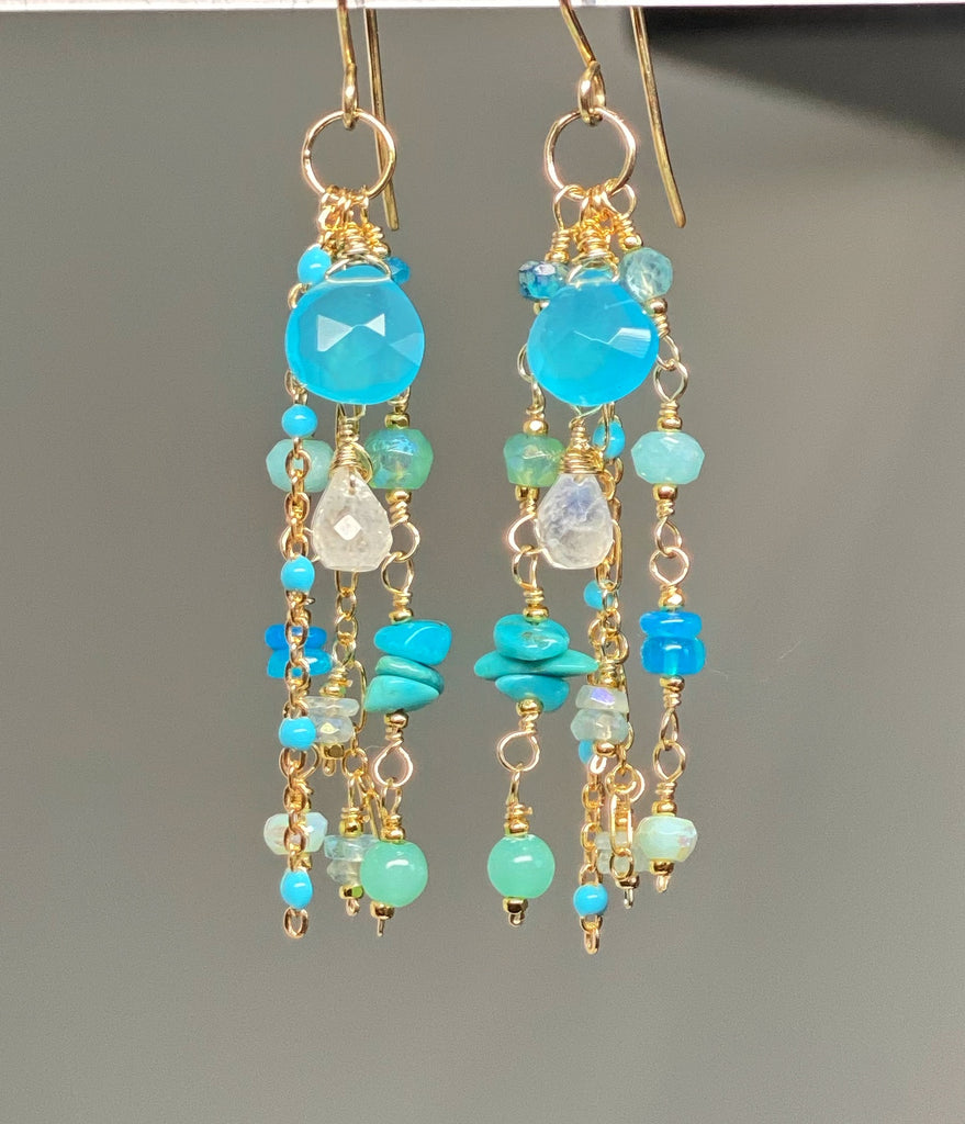 Vibrant aqua blue chalcedony briolettes dangle with rainbow moonstone briolettes and wire wrapped gemstone chains to create these glamorous, flirty summer/resort, handmade earrings.