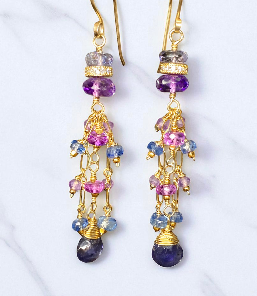 Blue Purple Gemstone Dangle Earrings, Tassel Style, Iolite, Amethyst, Gold Fill