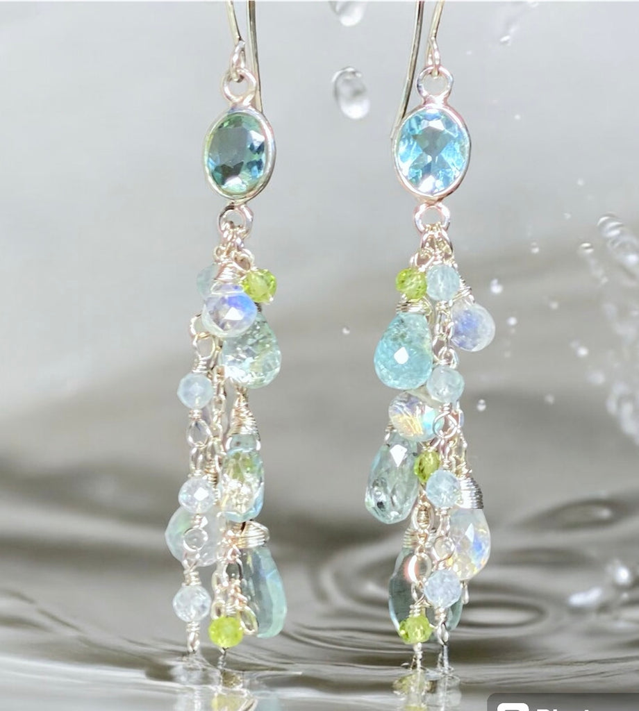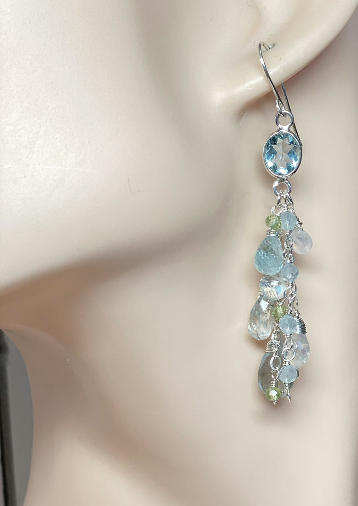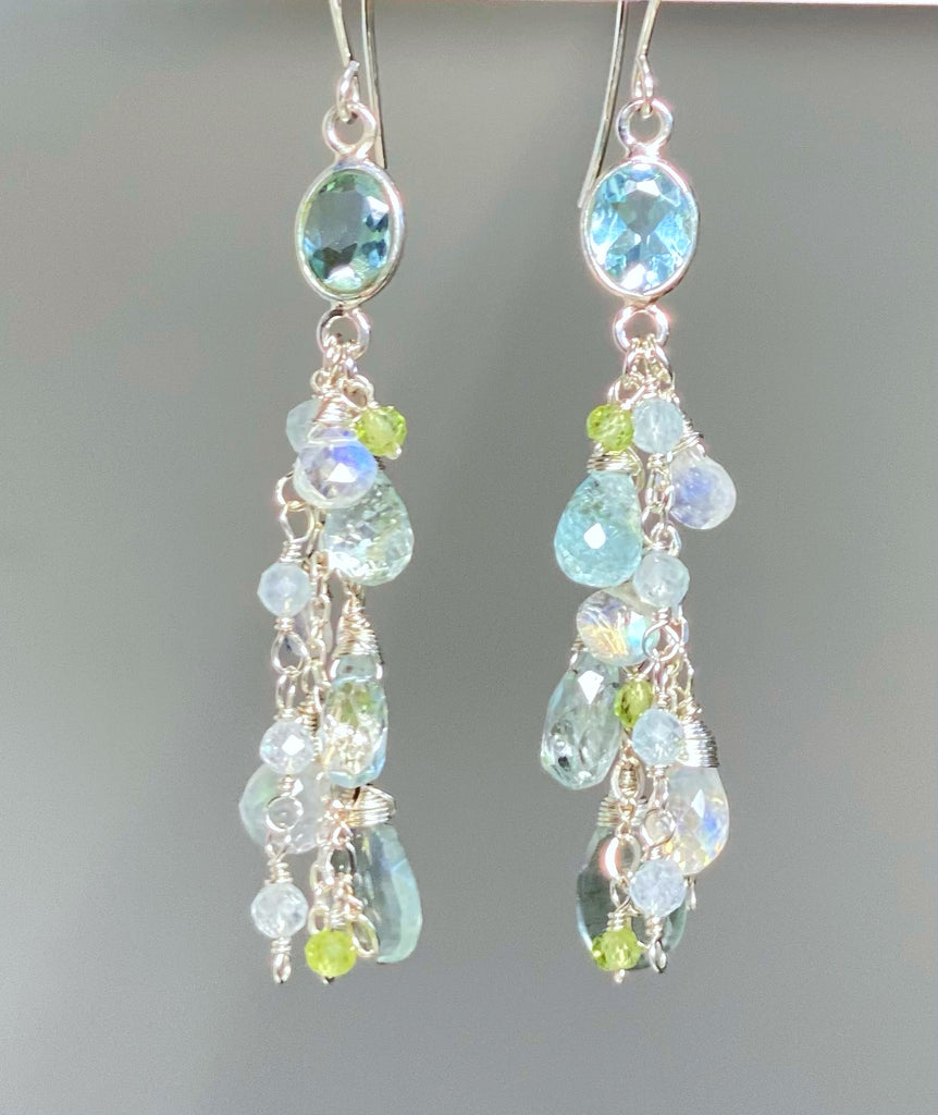 Enchanting and unique, these long gemstone dangle earrings feature sparkling blue topaz connectors (sterling silver) dangling gemstones of peridot, blue topaz, aquamarine and rainbow moonstones suspended on sterling silver chains.