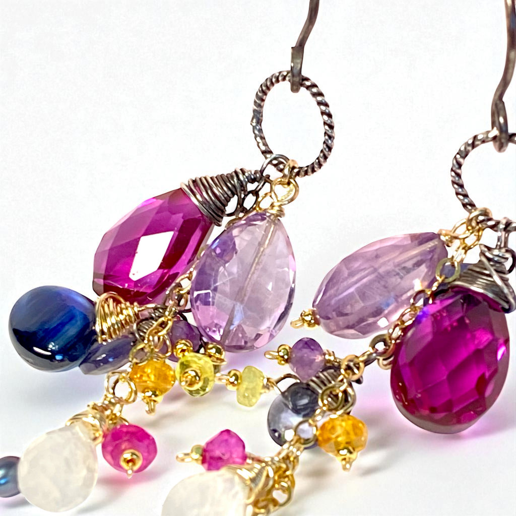 Beautiful violet quartz faceted pear briolettes dangle with gemstones of lavender pink amethyst, rainbow moonstone, iolite and blue kyanite gemstones and rondelles of exotic, rare chrysoberyl, pink amethyst, fanta orange garnet, violet quartz and tiny peacock pearls on 14 kt gold filled and oxidized sterling silver wires and chains to create these vibrant, colorful, dangle earrings.