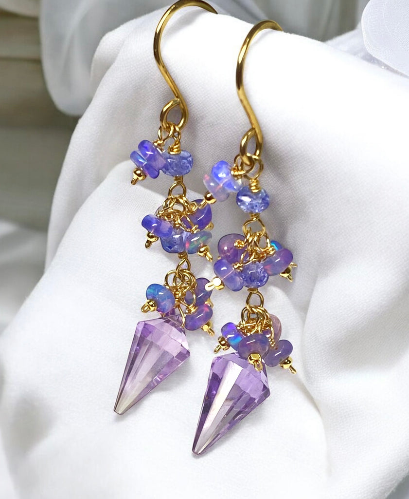 Amethyst Rose de France and Lavender Opal Dangle Earrings Gold Fill