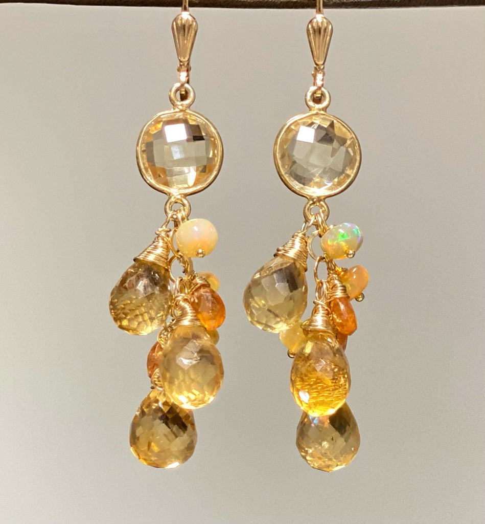 The gems and opals all dangle from faceted light citrine bezel set connectors and 14 kt gold filled lever back earrings.