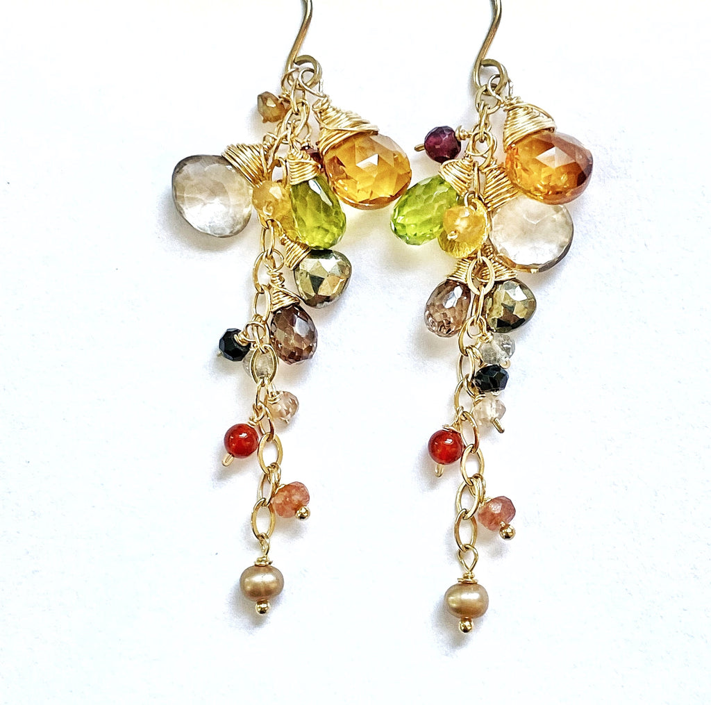 Sparkling briolettes of golden citrine, mystic smokey quartz, peridot and more are wire wrapped to dangle with multi color gemstone rondelles on 14kt gold filled chains to create these colorful, unique, handmade dangle earrings.