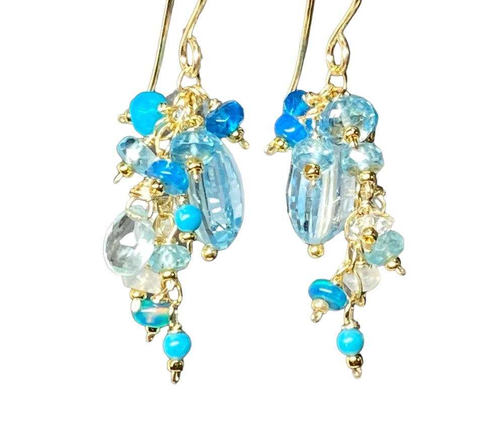 Gemstones of blue topaz, London blue topaz, fiery AAA aqua and peacock blue Ethiopian opals, neon and aqua apatite, rainbow moonstone, natural turquoise rounds, and Herkimer diamond crystals and more cluster and cascade down the sides of these sparkling blue topaz drops on 14 kt gold filled chains.