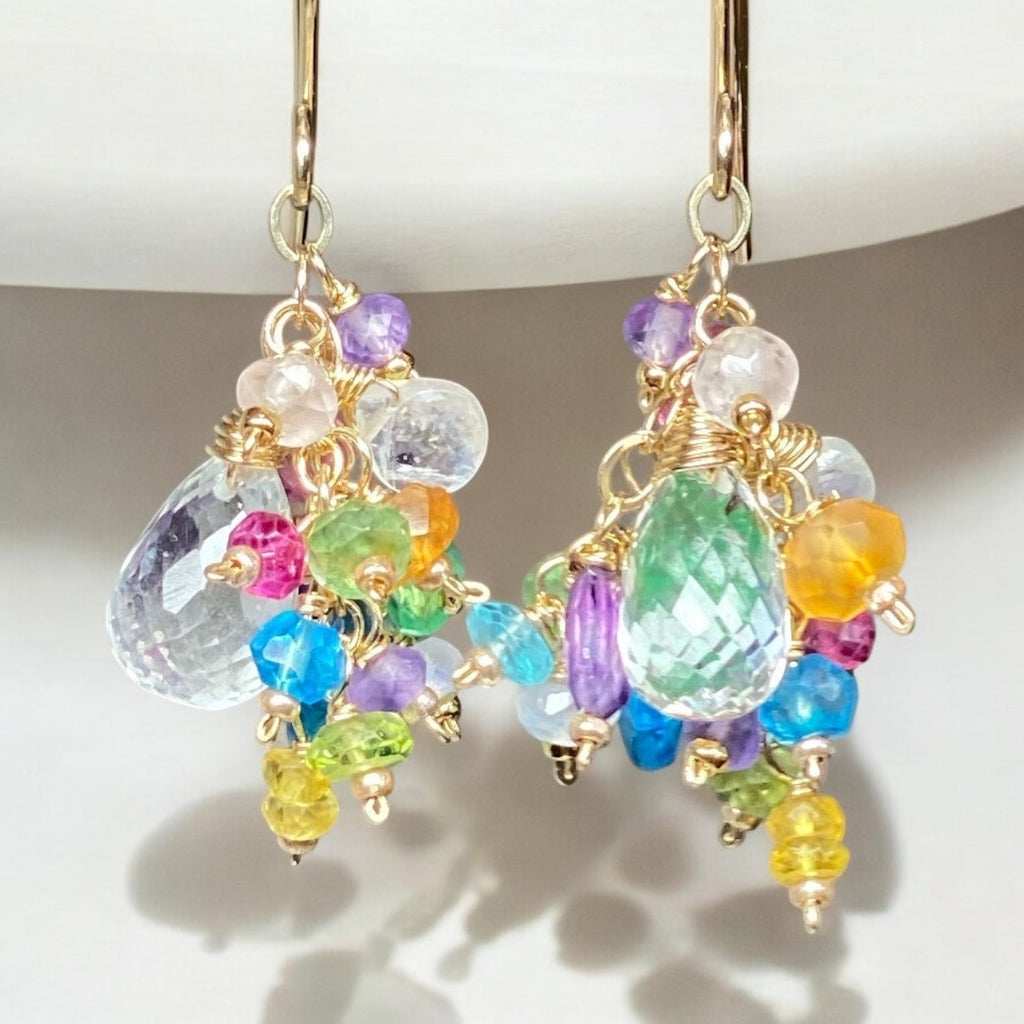 Crystal Quartz Dangle Earrings with Multi Gemstone Cluster Gold Fill 8