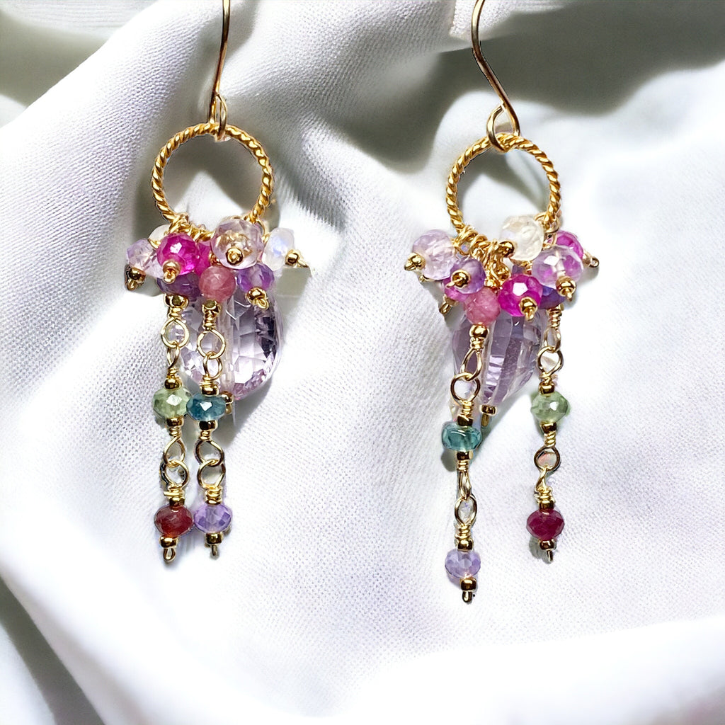 Pink Amethyst, Pink Quartz and Colorful Gem Dangle Earrings Gold Fill