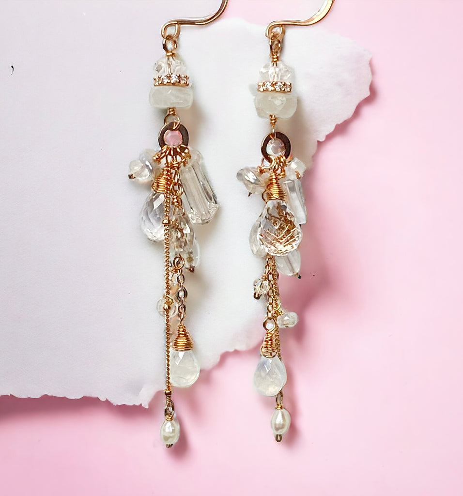 Rose Gold Boho Dangle Earrings with Crystal Quartz, Moonstone, Opals and Keishi Pearls