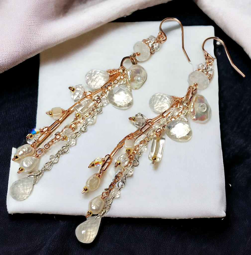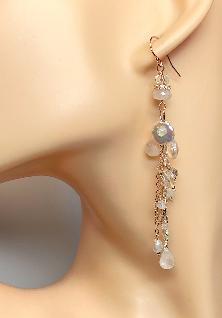 Rose Gold Long Boho Mystic Quartz, Pearl & Moonstone Dangle Earrings
