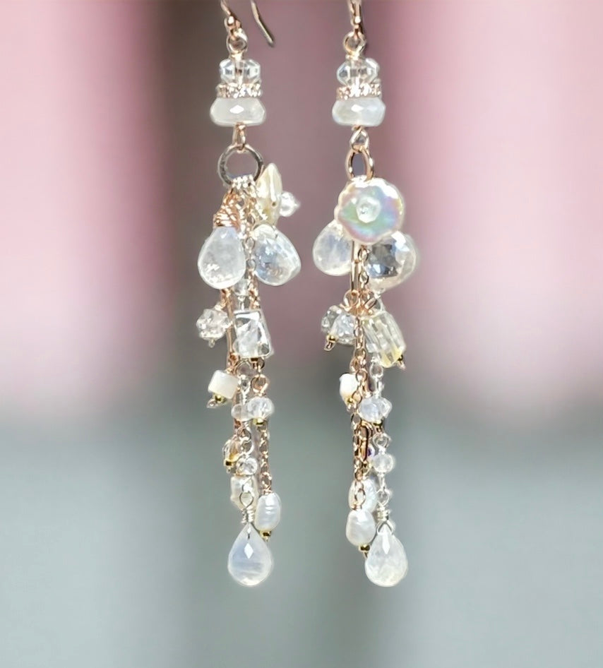 Faceted rainbow moonstone teardrops, mystic quartz gemstone briolettes and crystal quartz rectangles, wire wrapped in rose gold filled wires, dangle with lots of smaller stones and pearls to create these dazzling, sparkling boho dangle earrings.