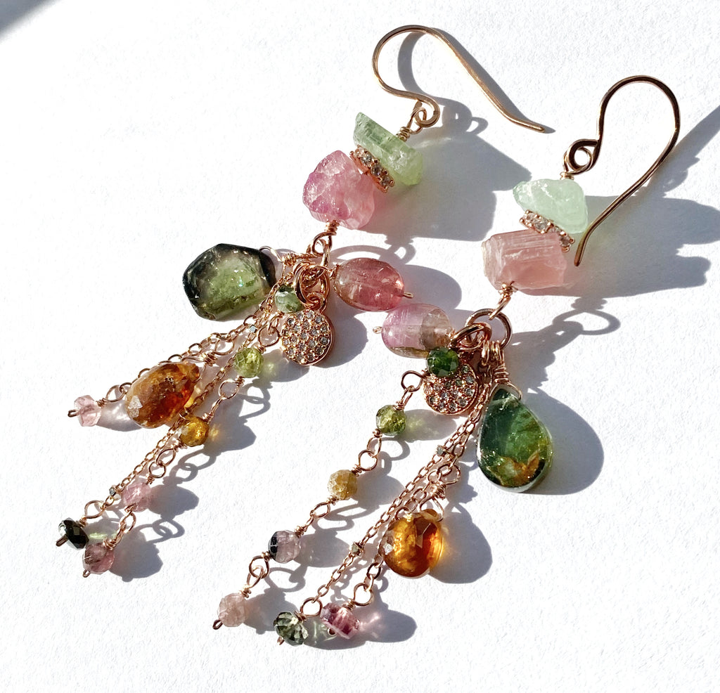Beautiful, hard to find, raw crystals of pink and light green gemstone tourmaline sandwich a rose gold pave crystal rondelle to create the top of these handmade earrings.