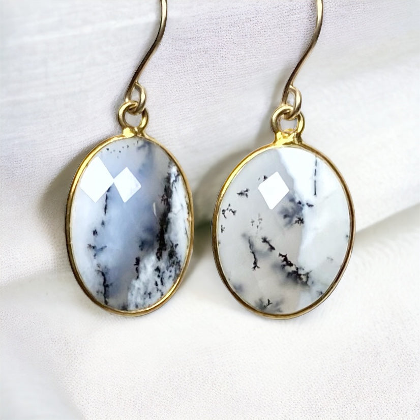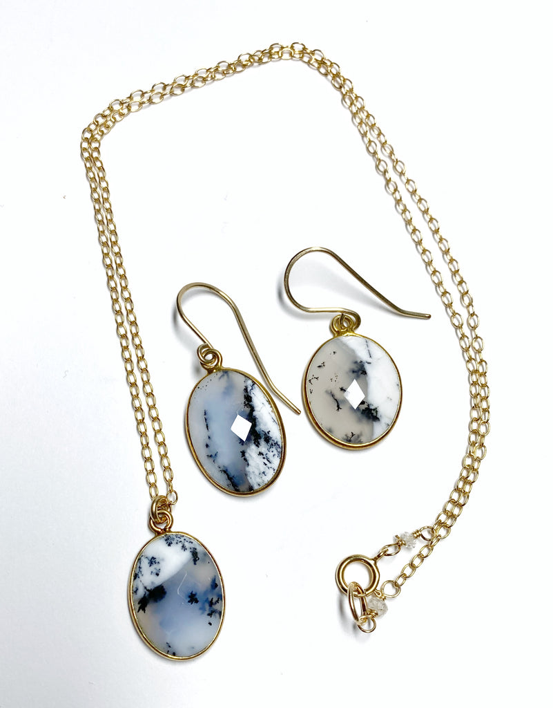 Dendritic Opal Earrings and Pendant Jewelry Set Gold Fill
