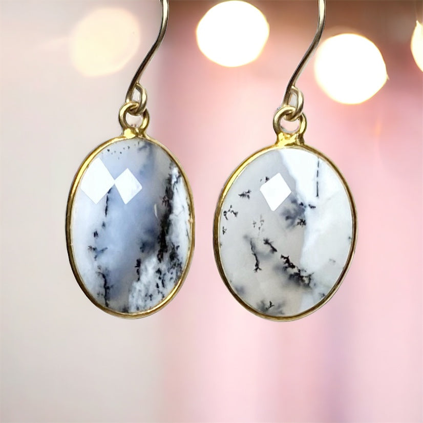 The coordinating pair of earrings feature more dendritic opal faceted cabochons set in the same way as the pendant to dangle from 14 kt gold filled French hook earrings.