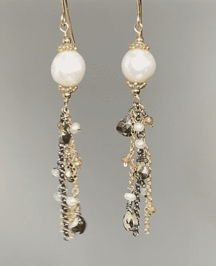 Shimmering white Edison pearls, with their metallic gleam, dangle mixed metal chains of 14 kt gold filled and oxidized sterling silver to dangle faceted pyrite briolettes and tiny dangles of gold mystic labradorite, pearls, labradorite and faceted natural clear zircon that sparkles like tiny diamonds.
