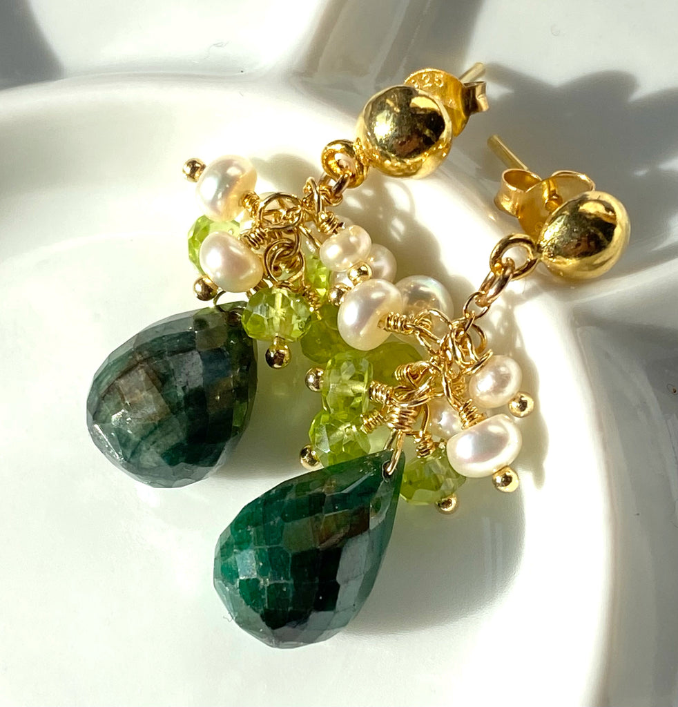 Emerald and Peridot Pearl Cluster Earrings Gold